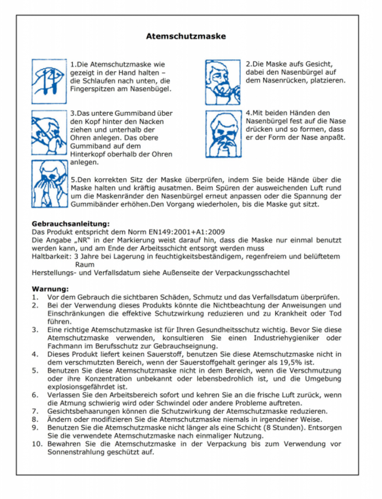 – Entspricht der Norm EN 149:2001+A1:2009 mit CE Zertifikat